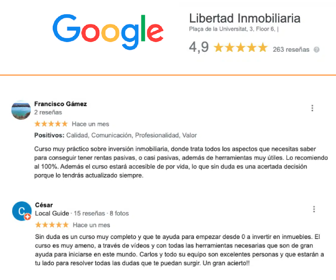 Por lo que la mayoría de los que terminan el curso aseguran que Libertad Inmobiliaria les proporciona las herramientas necesarias para moverse con más seguridad en el mundo de la inversión. Ahora bien, como en cualquier formación, lo importante es lo que hagas con todo esto.