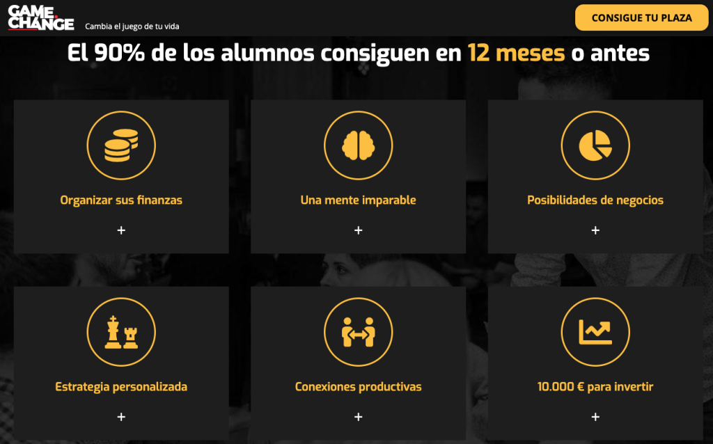 Como su nombre en ingles indica, es un cambio de juego. La formación de Adrián Gleez no es un curso financiero típico. Está diseñado para aquellos que buscan transformar su mentalidad, aprender a gestionar mejor su dinero y generar ingresos de manera sostenida con una inversión inicial mínima o nula. Este programa se basa en un enfoque práctico y accesible para todo tipo de personas, con el objetivo principal de ayudar a sus participantes a obtener 10.000€ en 12 meses mediante la combinación de mentalidad, estrategias de negocio, manejo financiero y el poder del networking. Como ya había dicho, un cambio de juego total, que te ayudara a ascender de liga.