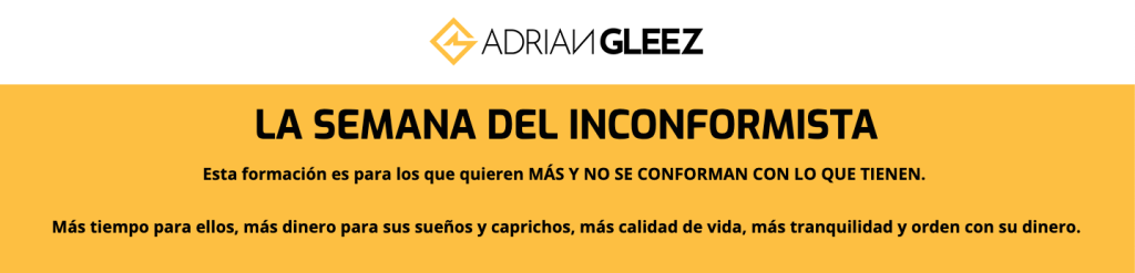 Antes de invertir y formar parte de este programa, te recomiendo que participes en «La semana del inconformista», una formación gratuita que Adrián Gleez ofrece para las personas que están interesadas en conseguir cambios. Consta de 4 clases online en directo que el mismo realiza. En ellas te explicara y enseñará algunos de sus métodos y procesos para que tu puedas empezar a emplearlos y comenzar a generar ingresos. Te ayudará muchísimo a tomar una decisión de si quieres ir a por más, o decidir que aún no es el momento. No pierdes nada por intentarlo y no te cuesta ni un $ el participar en esta formación gratuita. !Anímate!, te sacará de dudas.